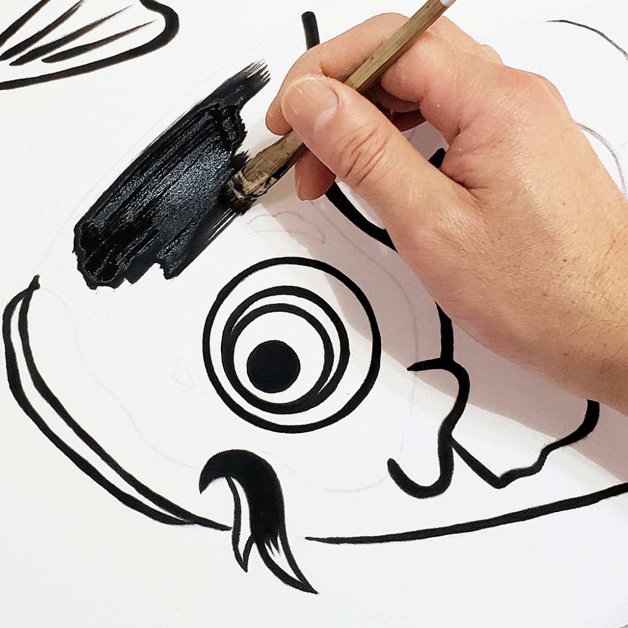遠くから見るとエラや鱗(うろこ)の太い線に力強さを感じますが、近くで見ると顔やヒレの繊細な筆づかいも感じられます。