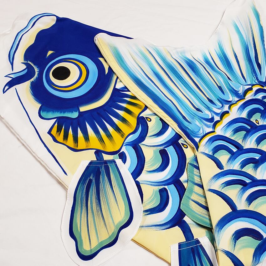 鯉のぼりでは省略されがちな鯉の『尻ビレ(舵ビレ)』をきちんと再現し背ビレ同様に縫製したり、各ヒレに動きを出すために曲線をいかしたステッチをかけたりと細かい部分にまでこだわっています。