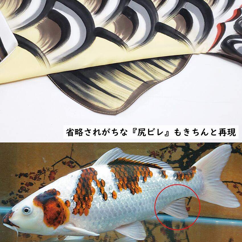 鯉のぼりでは省略されがちな鯉の『尻ビレ(舵ビレ)』をきちんと再現し背ビレ同様に縫製したり、各ヒレに動きを出すために曲線をいかしたステッチをかけたりと細かい部分にまでこだわっています。