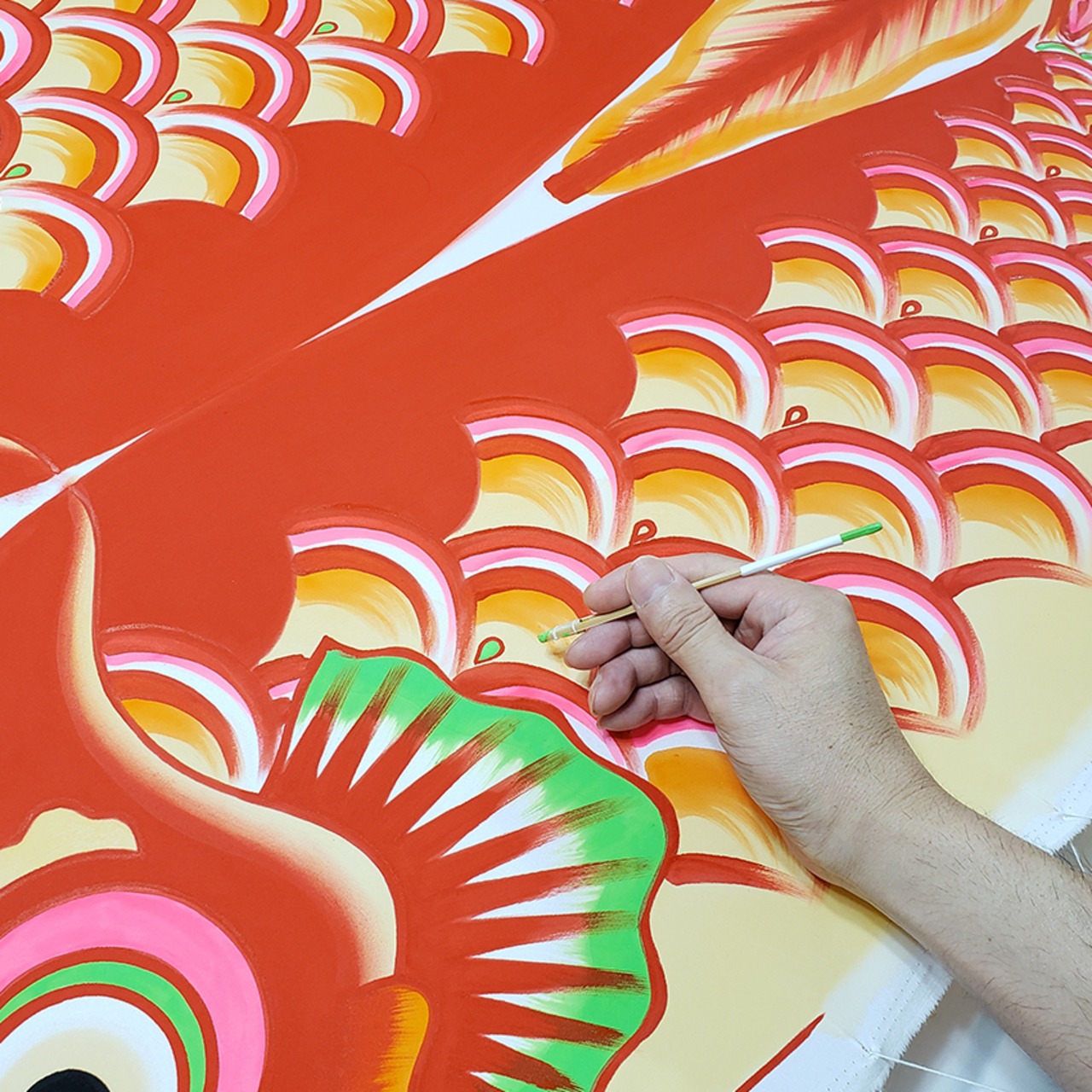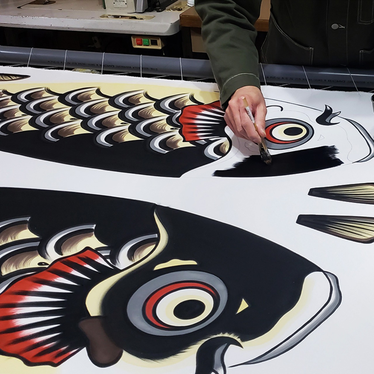 鯉のぼりでは省略されがちな鯉の『尻ビレ(舵ビレ)』をきちんと再現し背ビレ同様に縫製したり、各ヒレに動きを出すために曲線をいかしたステッチをかけたりと細かい部分にまでこだわっています。
